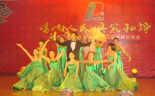 本网讯 欢声笑语辞旧岁,莺歌燕舞迎新年。12月28日18时30分,由人民电器集团、温州大学瓯江学院和柳市镇长虹村共同举办的《唱响人民·共筑和谐》2008年庆元旦迎新春联欢晚会在集团总部多功能厅隆重举行。正在外地考察工作的郑元豹董事长、叶玉森总经理发来贺电,预祝晚会取得圆满成功,祝愿全体员工新年快乐,万事如意。